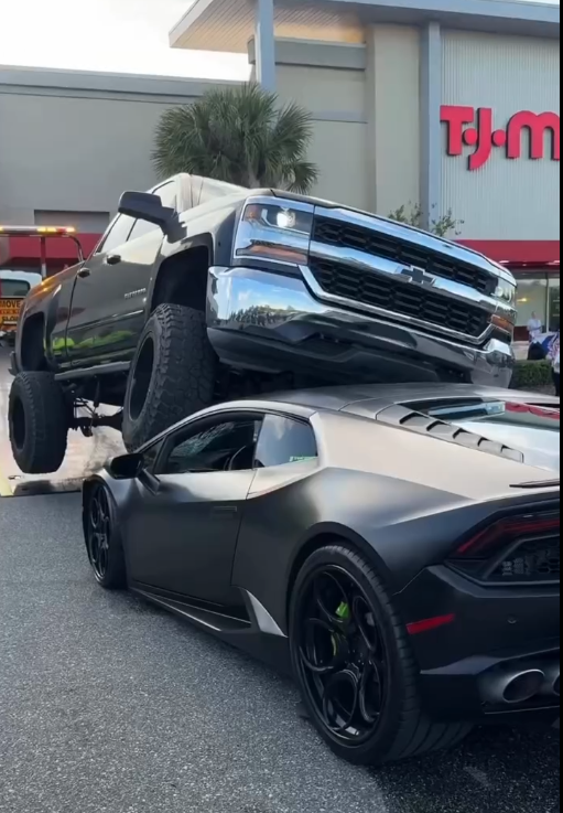 Viral footage captures the moment a three-ton pickup used a $200,000 supercar as a